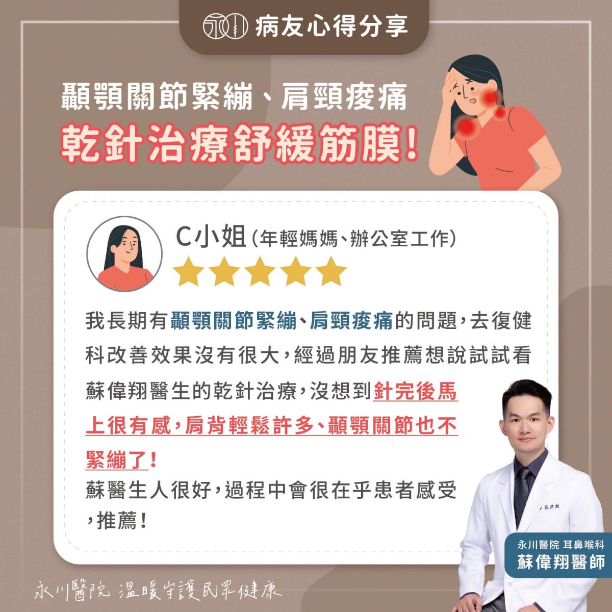 【肩頸痠痛+顳顎關節炎】乾針治療解除緊繃疼痛|台南永川醫院蘇偉翔醫師