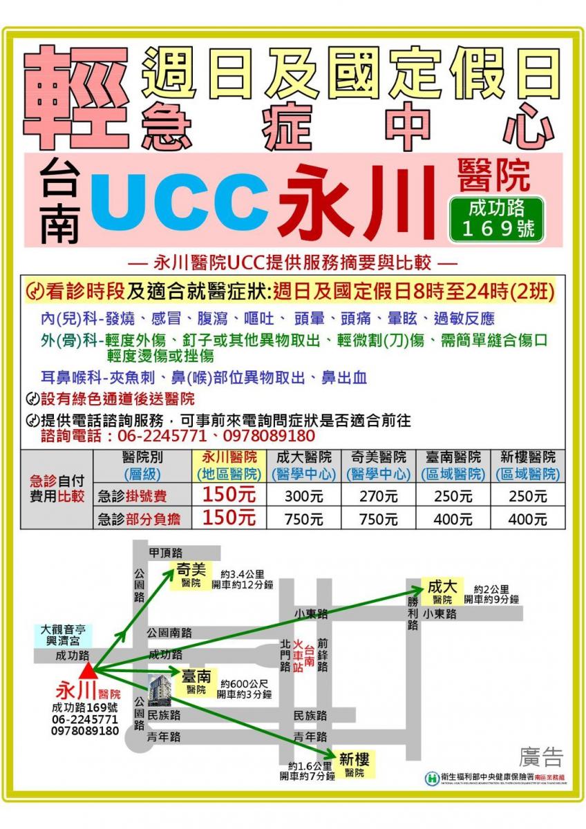 衛福部仿照日本開設「假日急症中心(UCC)」專門處理輕症病人,健保署今(16)日表示,UCC確定11月2日試行上路,目前六都已經有14個地點申請,規劃只有週日與國定假日開診,看診時間從上午8點到凌晨12點。根據就醫指引,包含發燒、簡單傷口等5類情況的患者,可以先到UCC就醫處置,不用到大醫院耗時等待,部分負擔花費最多可省下600元。